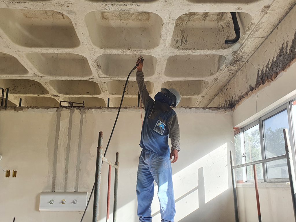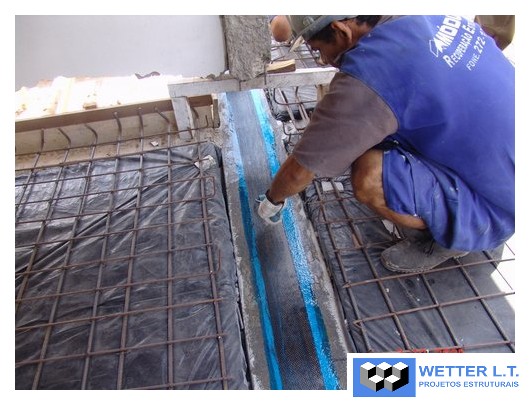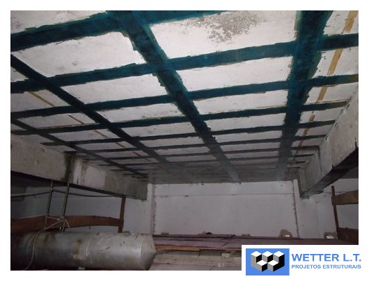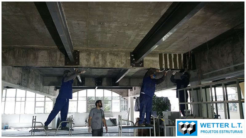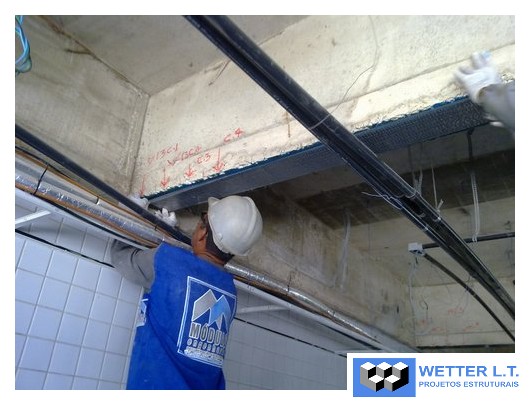 Aplicação de 690m2 de fibra de carbono MBrace CF 130 e perfis metálicos nas lajes...